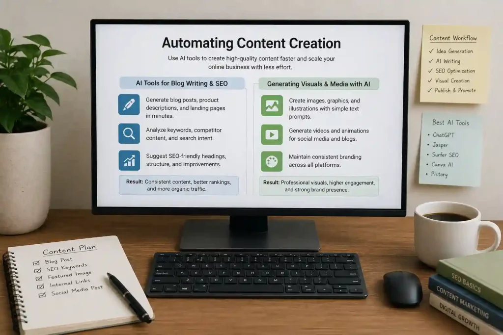 SEO optimization is a critical part of online visibility. AI tools help identify the best keywords, suggest headings, and structure content for better ranking on Google. This allows businesses to publish content consistently without hiring large writing teams. Over time, consistent AI-generated content improves domain authority and organic traffic.