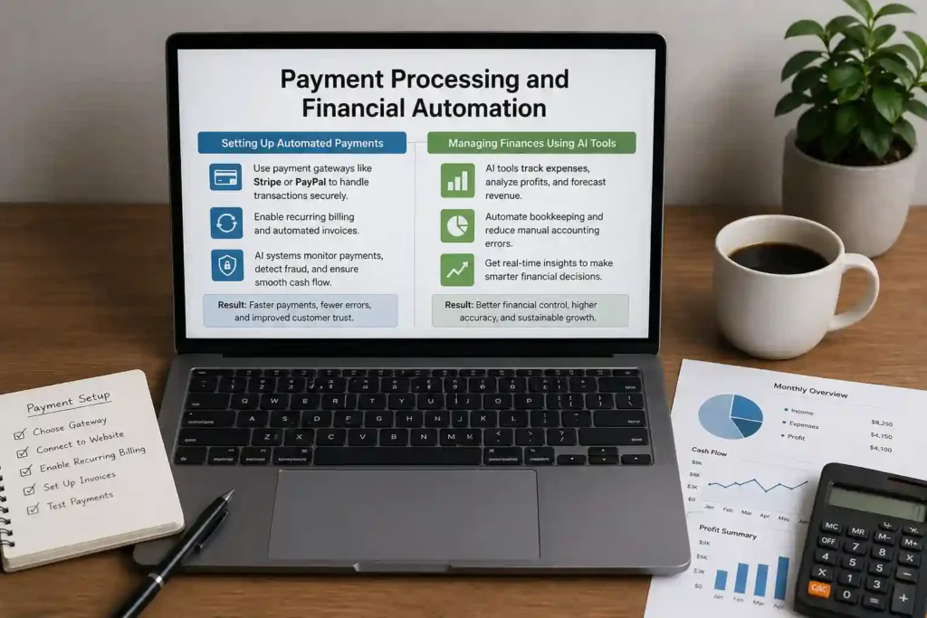 Modern online businesses rely on seamless payment processing systems to handle transactions efficiently. Automated payment gateways like Stripe or PayPal enable instant payments, recurring billing, and secure transactions without manual involvement. Financial automation reduces human error, speeds up cash flow, and improves customer trust. Businesses can integrate AI systems to monitor payments, detect fraud, and optimize revenue tracking in real-time.